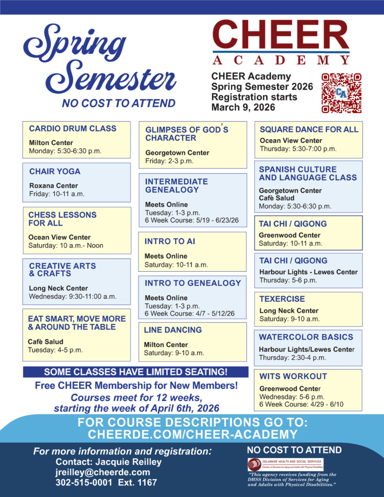 Spring Into Learning:CHEER Academy Announces 2026 Spring Semester As the seasons change, so do the opportunities for growth and connection at CHEER! Our first semester has had an exciting start! We’re excited to announce that CHEER Academy Spring Semester is just around the corner, offering a diverse array of classes designed to keep Sussex County…