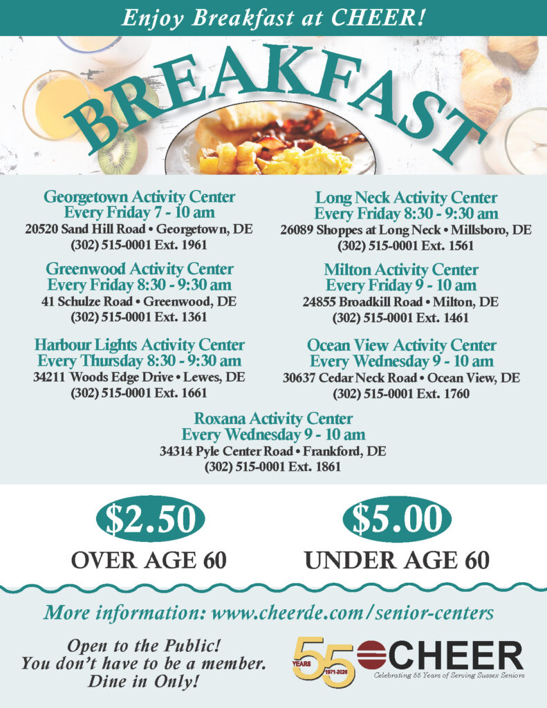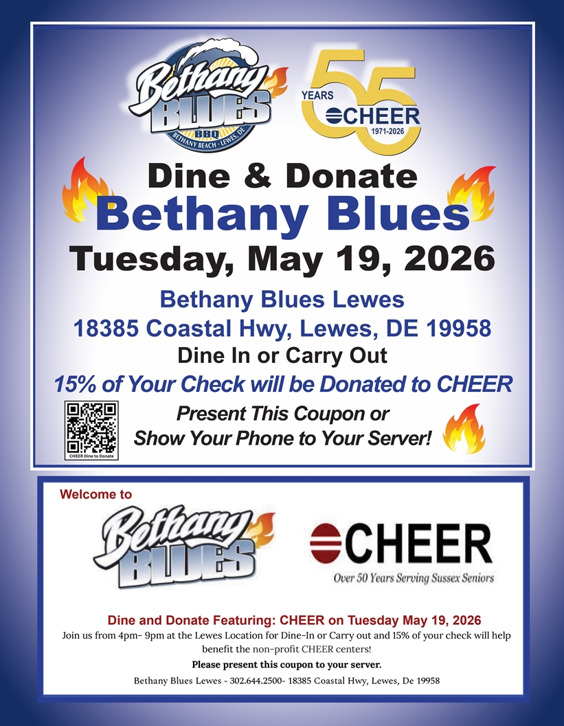 Contributions to CHEER support our mission to promote and maintain the highest quality of life and independence for our mature population throughout Sussex County. Your gift will help expand and diversify a wide range of services and programs supporting healthy and active lifestyles for our members 50 years and over, as well as providing support for their family members and caregivers.