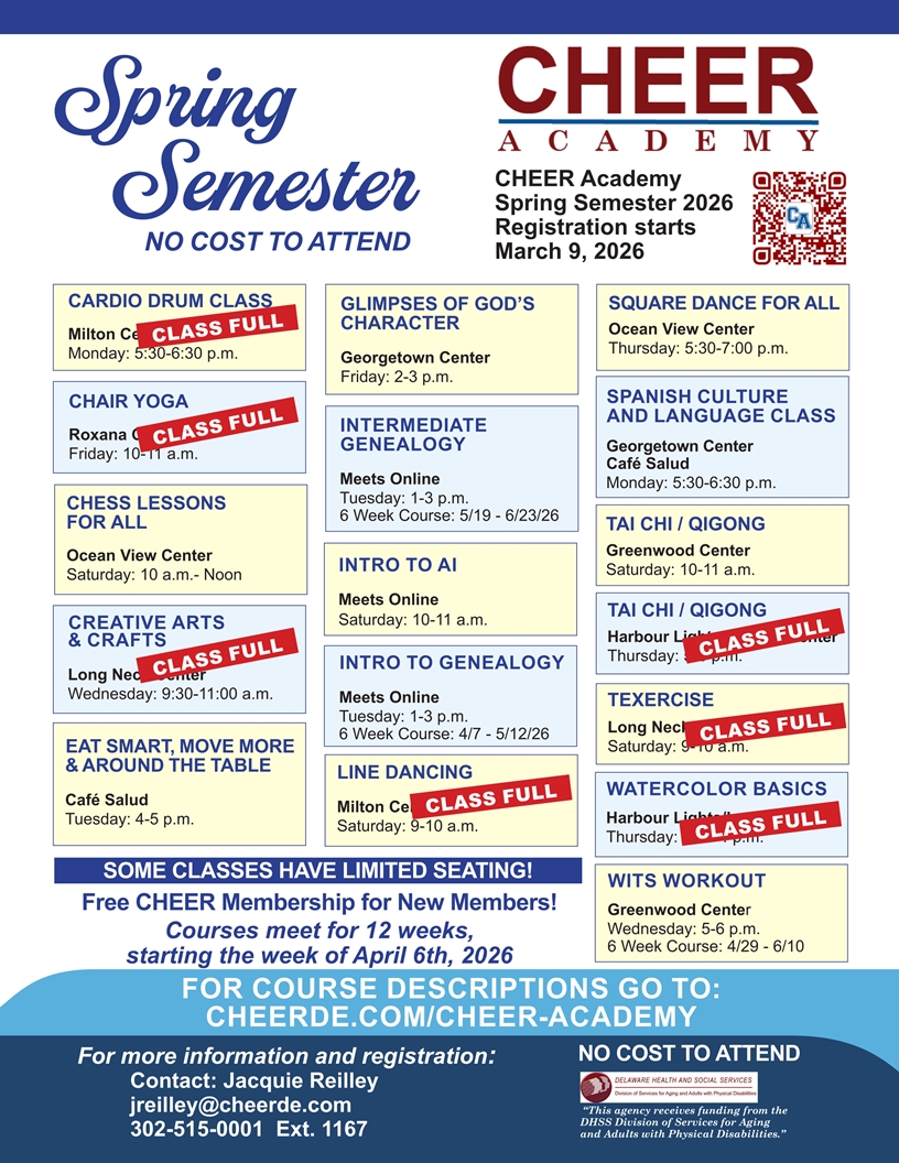 Spring Into Learning:CHEER Academy Announces 2026 Spring Semester As the seasons change, so do the opportunities for growth and connection at CHEER! Our first semester has had an exciting start! We’re excited to announce that CHEER Academy Spring Semester is just around the corner, offering a diverse array of classes designed to keep Sussex County…