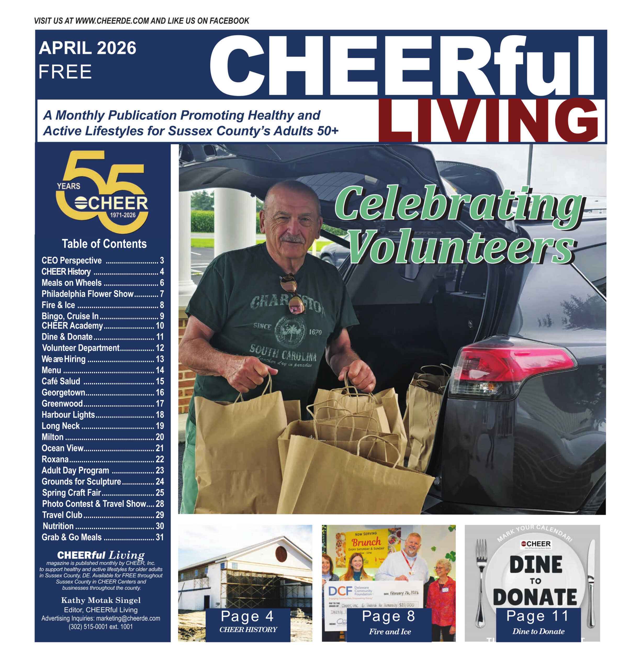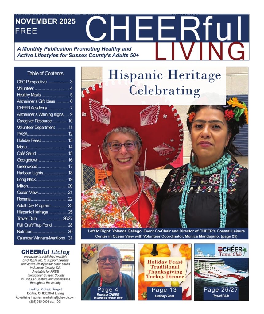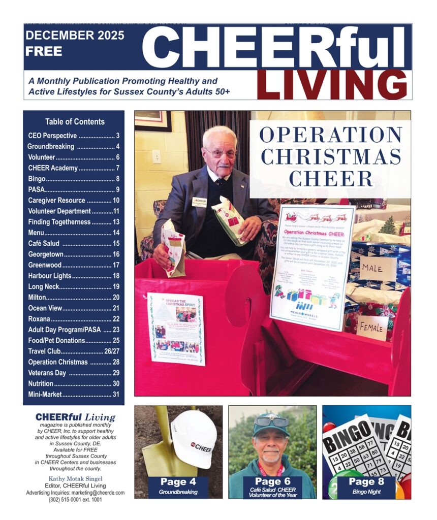 CHEER publishes a monthly newspaper – CHEERful Living – that keeps the public informed about events, activities and goings-on with the members of the non-profit agency. Public interest news stories, feature stories spotlighting members, and numerous photos are featured in each issue. It is published at the beginning of each month and distributed directly to medical offices and county professional businesses throughout Sussex County, Delaware, as well as to members at the centers, and sent out to the home bound in the Meals on Wheels lunch bags.