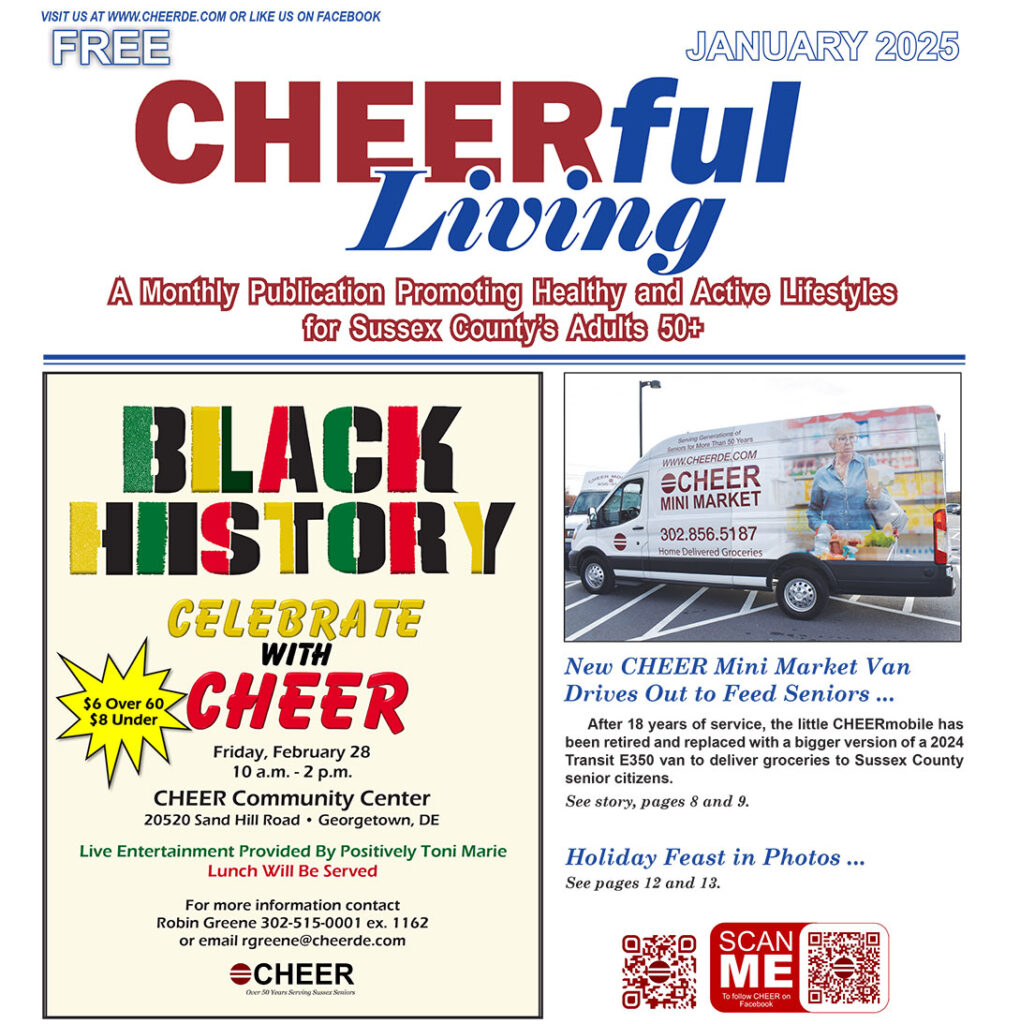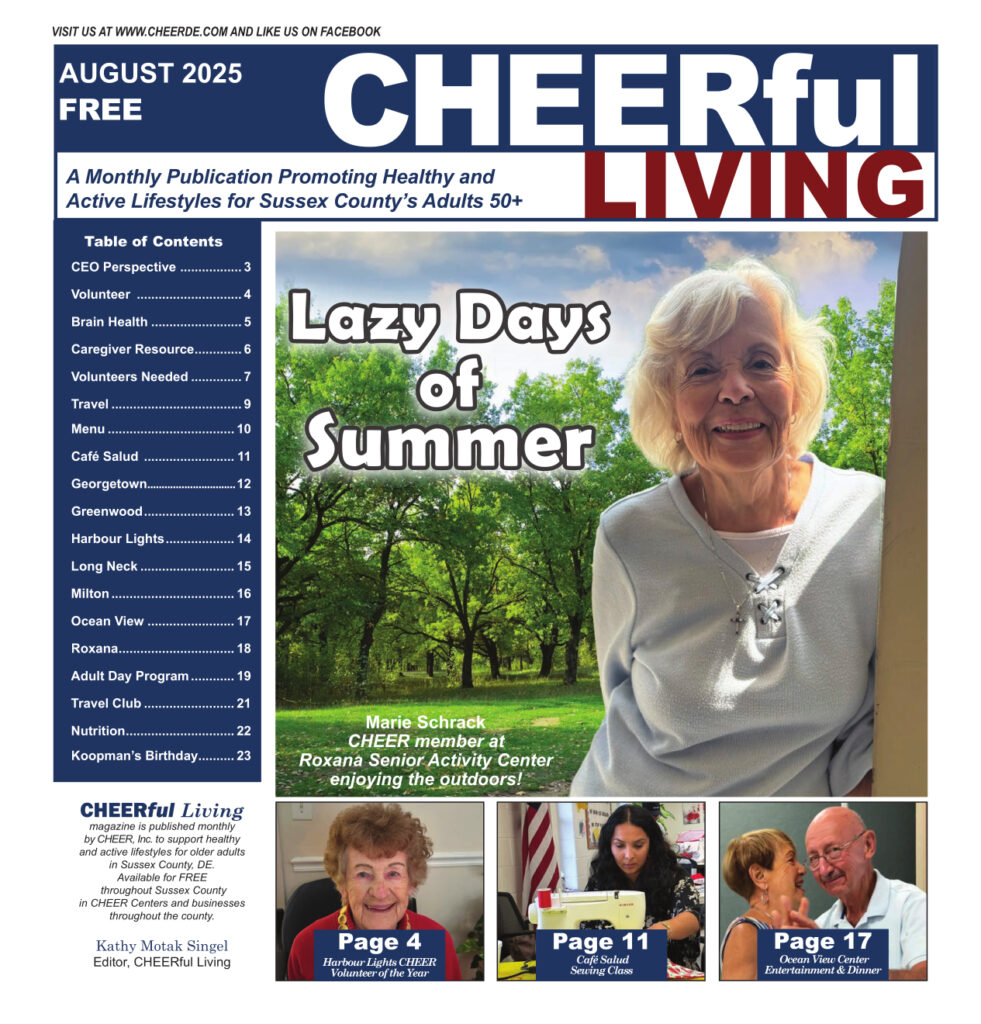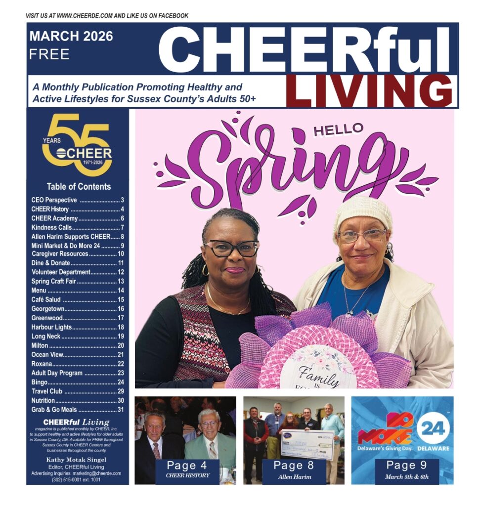 CHEER publishes a monthly newspaper – CHEERful Living – that keeps the public informed about events, activities and goings-on with the members of the non-profit agency. Public interest news stories, feature stories spotlighting members, and numerous photos are featured in each issue. It is published at the beginning of each month and distributed directly to medical offices and county professional businesses throughout Sussex County, Delaware, as well as to members at the centers, and sent out to the home bound in the Meals on Wheels lunch bags.