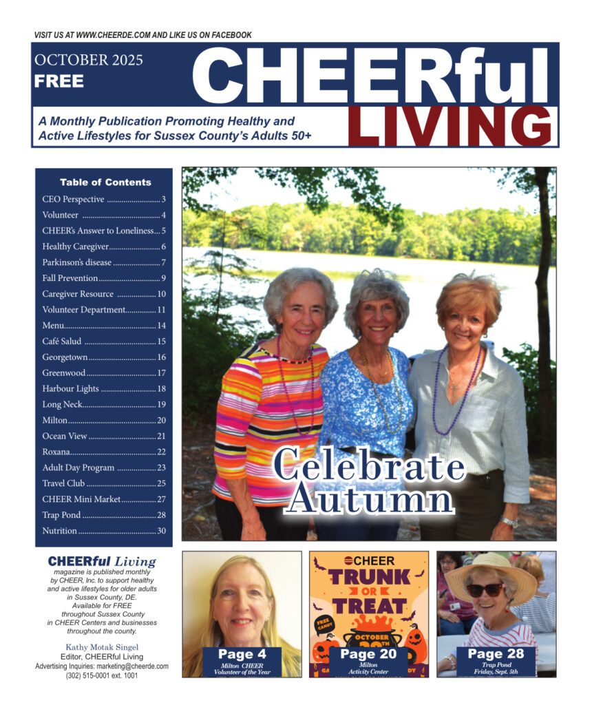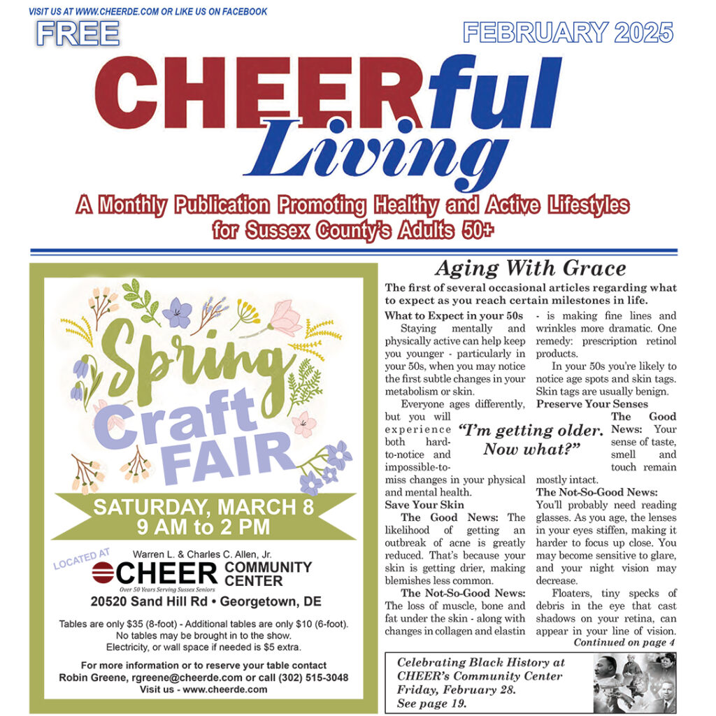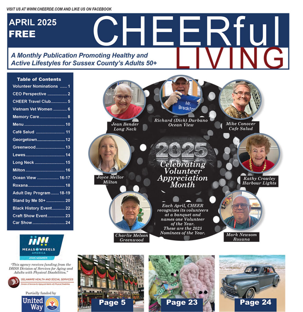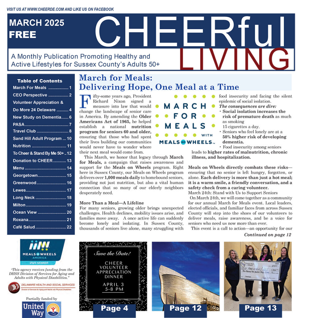 CHEER publishes a monthly newspaper – CHEERful Living – that keeps the public informed about events, activities and goings-on with the members of the non-profit agency. Public interest news stories, feature stories spotlighting members, and numerous photos are featured in each issue. It is published at the beginning of each month and distributed directly to medical offices and county professional businesses throughout Sussex County, Delaware, as well as to members at the centers, and sent out to the home bound in the Meals on Wheels lunch bags.