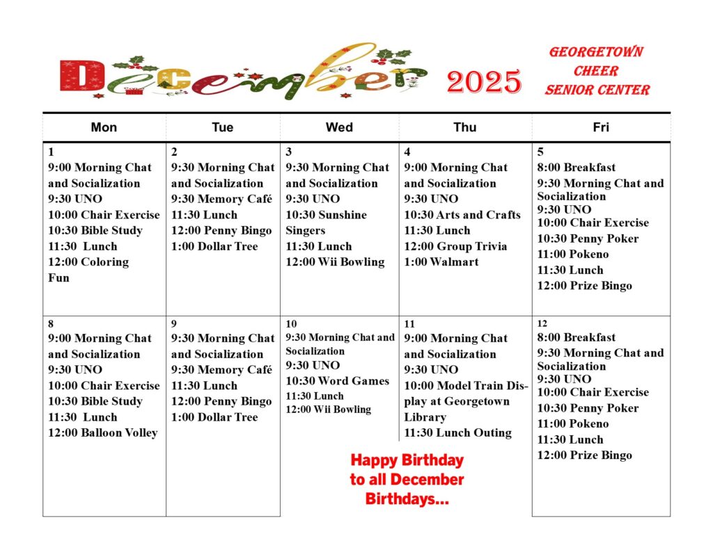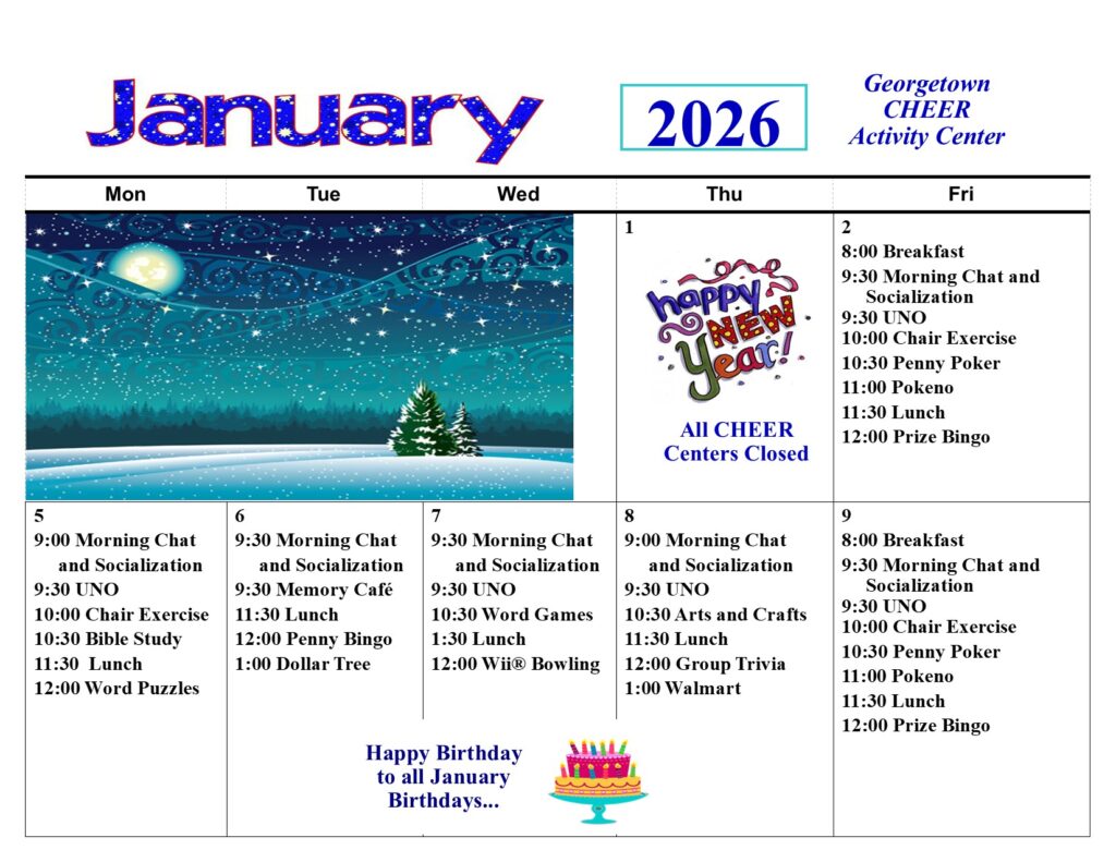 CHEER’s Georgetown Activity Center is open to individuals aged 50 and older. The cost for yearly membership is $30 and can be used at all eight CHEER Center locations. The Georgetown Center is open weekdays 8 a.m. to 4:30 p.m. is located in the CHEER Community Center, 20520 Sand Hill Road.
