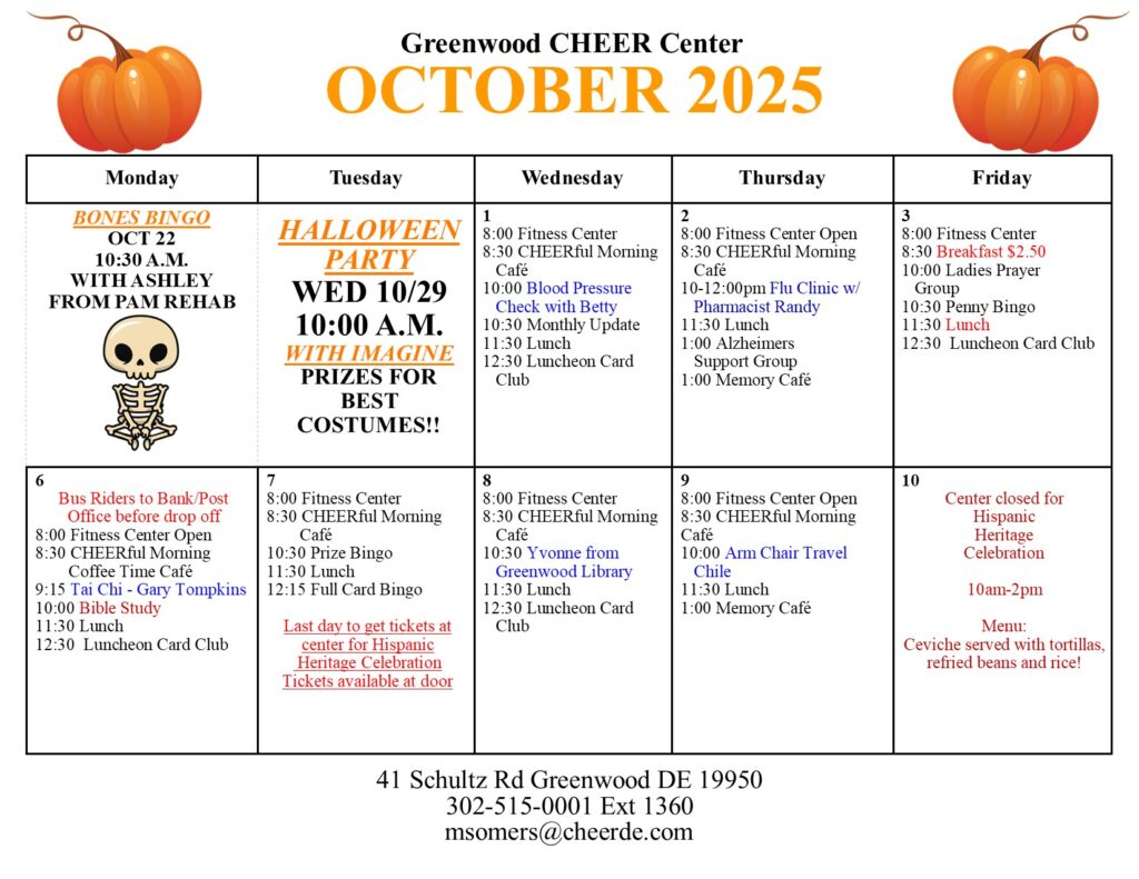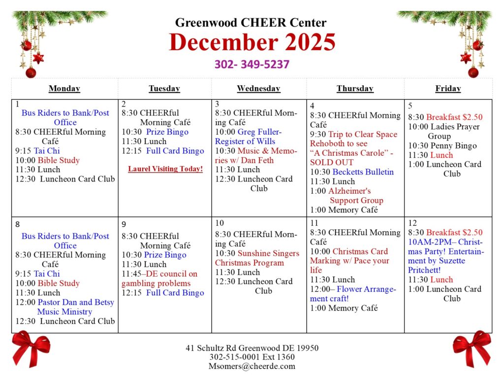 CHEER’s Greenwood Activity Center is open to individuals aged 50 and older. The cost for yearly membership is $30 and can be used at all eight CHEER Center locations. Greenwood Center is open weekdays 8 a.m. to 4:30 p.m. at 41 Schulze Road in Greenwood, Delaware.