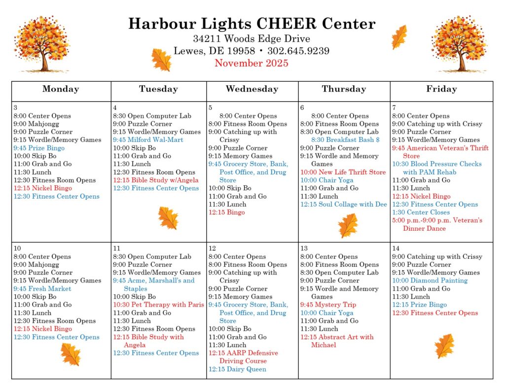 Harbour Lights Activity Center is open to individuals aged 50 and older. The cost for yearly membership is $30 and can be used at all eight CHEER Center locations. Harbor Lights is located at Lewes Center, 34211 Woods Edge Drive in Lewes, Delaware and is open weekdays 8 a.m. to 4:30 p.m.