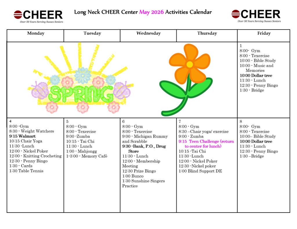 CHEER’s Long Neck Activity Center (Pelican Cove) is open to individuals aged 50 and older. The cost for yearly membership is $30 and can be used at all eight CHEER Center locations. Pelican Cove at Long Neck Center is open weekdays 8 a.m. to 4:30 p.m. located at 26089 Long Neck Road in Long Neck.