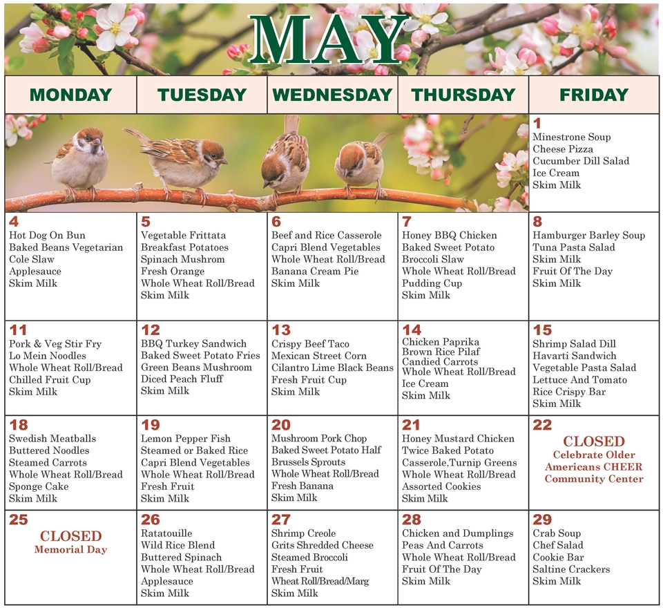 Heart-healthy, midday meals are available to persons aged 60 plus for a suggested donation of $3.50 – individuals under the age of 60 the suggested donation is $4.50. Lunch is served Monday through Friday, 11:30 a.m. to 12:30 p.m. For pre-qualified Homebound clients, if you prefer, your caretaker can pick up the client’s lunch between 10:45 a.m. and 11:45 a.m.