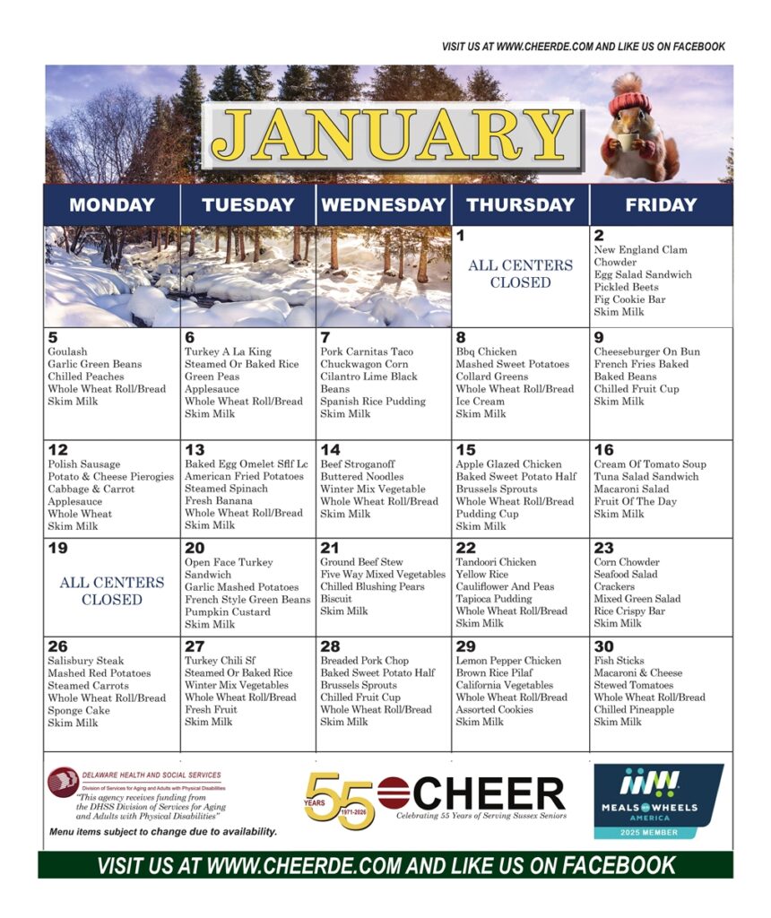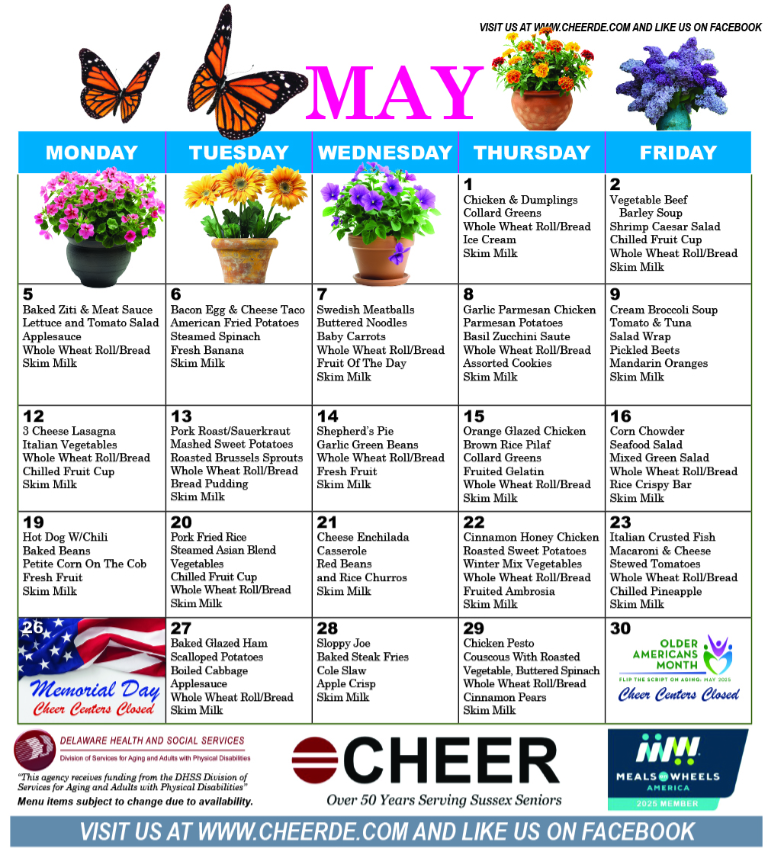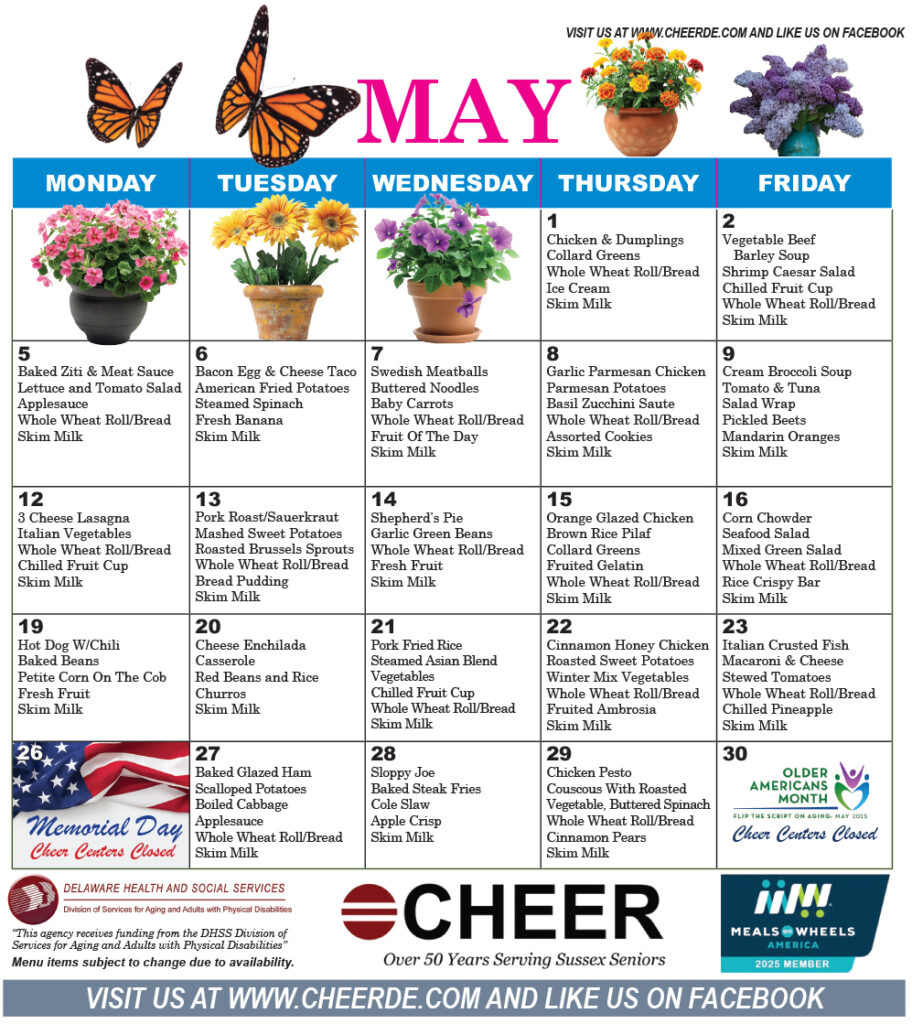 The CHEER Nutrition Program serves heart-healthy meals.All menus are approved by the State Dietitian.A donation is requested for meals. DOWNLOAD MENU DOWNLOAD MENU