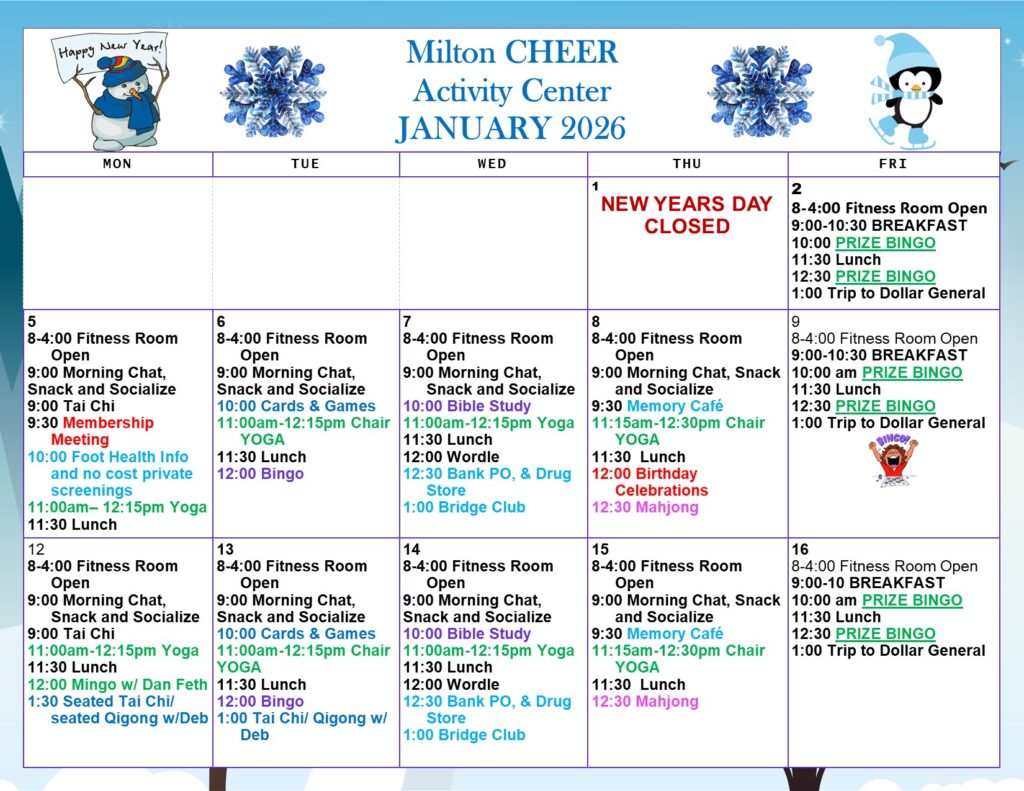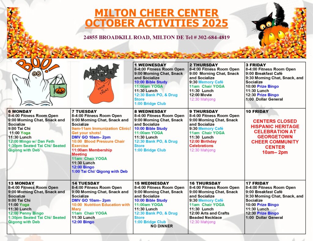The CHEER Milton Activity Center is open to individuals aged 50 and older. The cost for yearly membership is $30 and can be used at all eight CHEER Center locations. Milton Center is open weekdays 8 a.m. to 4:30 p.m. located at 24855 Broadkill Road.